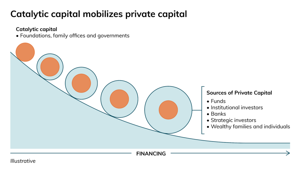 Private catalytic capital—such as that provided by foundations—offers a counterbalance. Catalytic capital refers to impact-driven capital with higher risk tolerance that helps attract other investors and accelerates the development of new solutions. This kind of capital can jump-start projects that traditional investors are not yet ready to fund but that have significant climate impact potential.